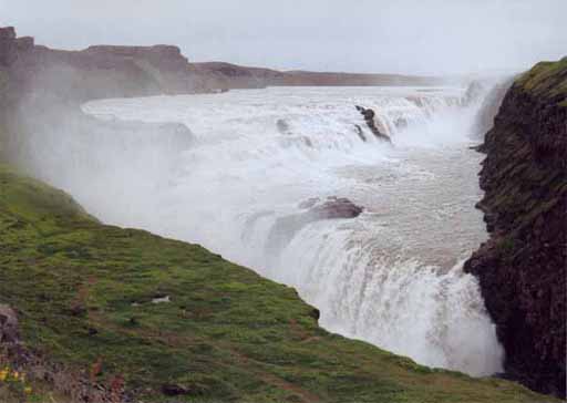 Der Gulfoss ist ein Wasserfall der durch den Gletscherfluss Hvita und zwei jeweils 32 Meter hohe Felsstufen gebildet wird. Daran anschließend erstreckt sich ein bis zu 70 Meter tiefer, 2,5 Kilometer langer Canyon. Bei schönem Wetter ergeben die aufgewirbelten Wassertröpfchen und die Sonne einen wunderschönen Regenbogen. Leider ist heute ein typisch isländischer Sommertag: nassgrau.